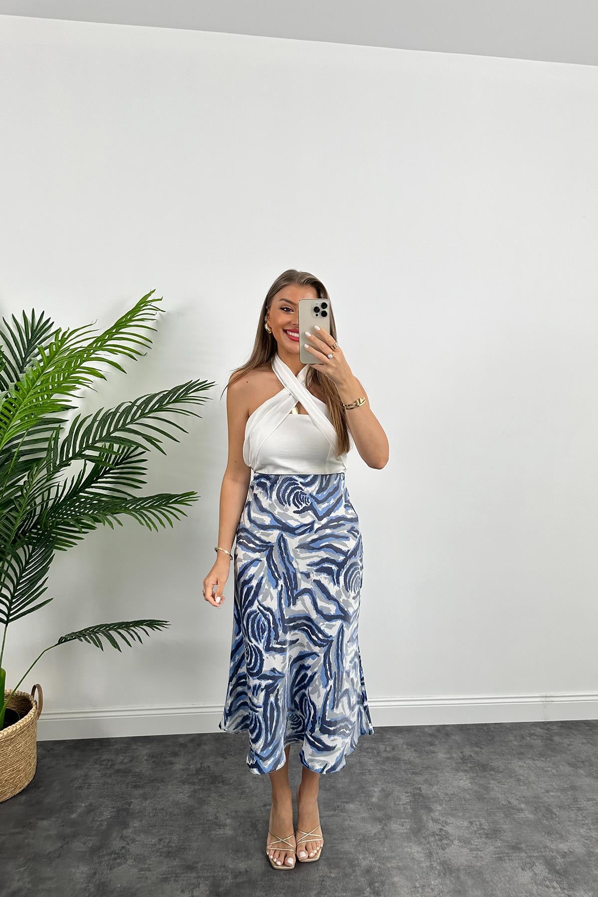 1. Sınıf Kalite Dışı Saten İçi Viskos Özel Dokulu Midi Boy Etek Mavi Beyaz Desenli