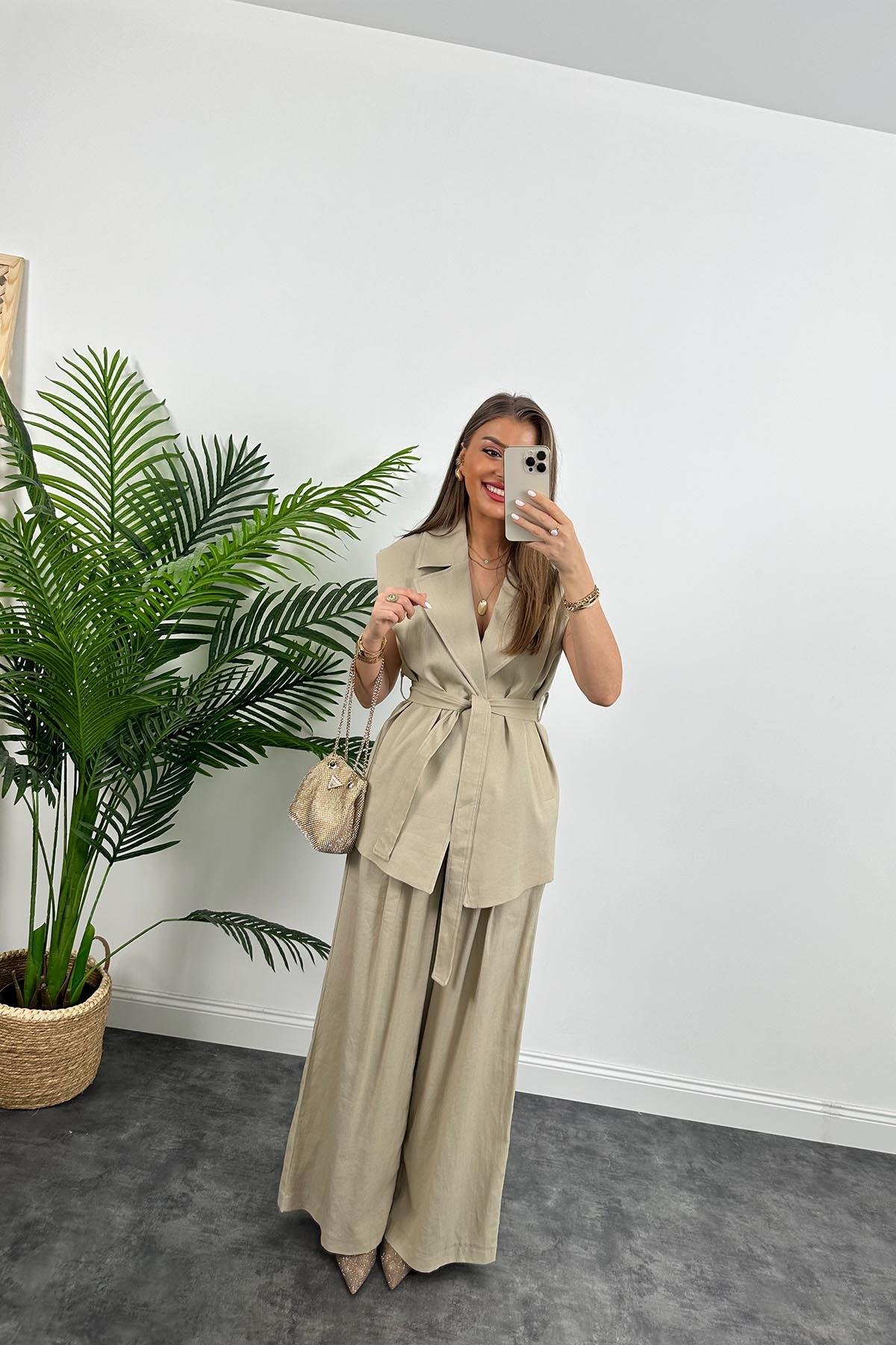 1. Sınıf Kalite Keten Kumaş Yelek Palazzo Pantolon Takım Taş