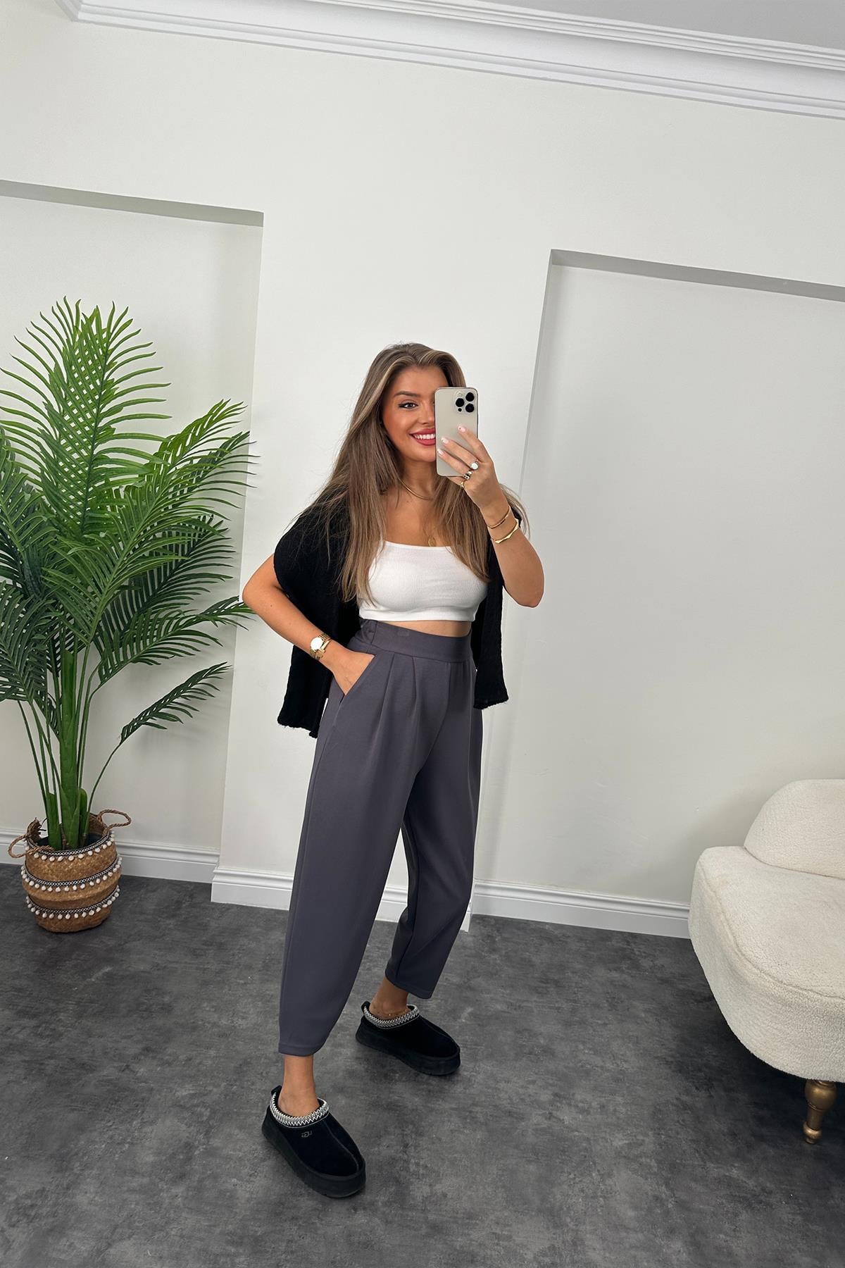 1. Sınıf Kalite Oysh Kumaş Beli Lastikli Harem Pantolon Antrasit