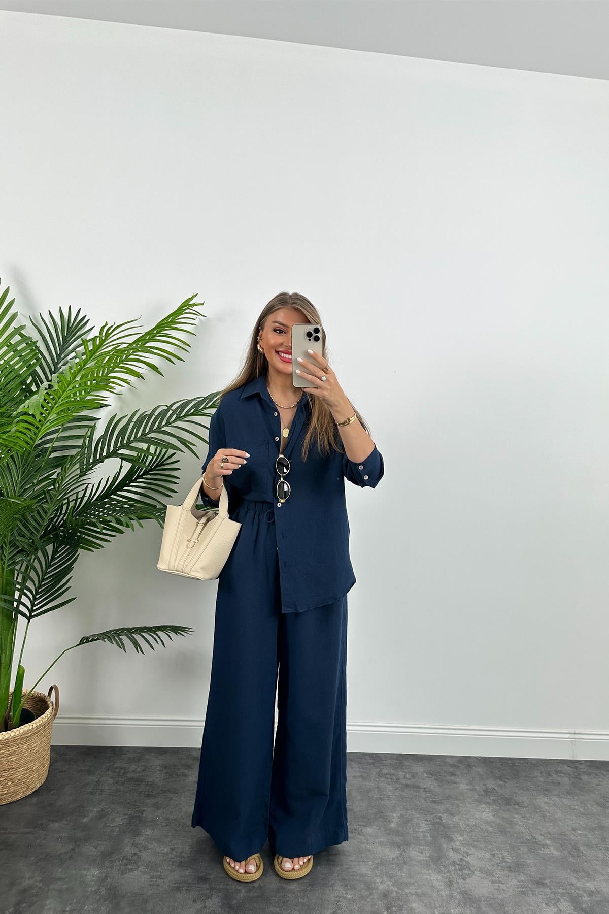 1. Sınıf Kalite Oysh Model %100 Keten Palazzo Gömlek Takım Lacivert (A11345)