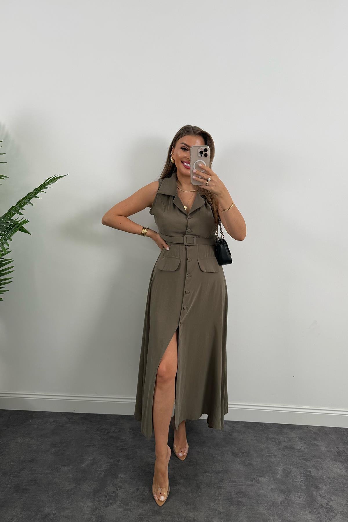 %100 Tensel Kumaş Lüx Kalite Düğmeli Kemerli Maxi Elbise Haki (A14045)