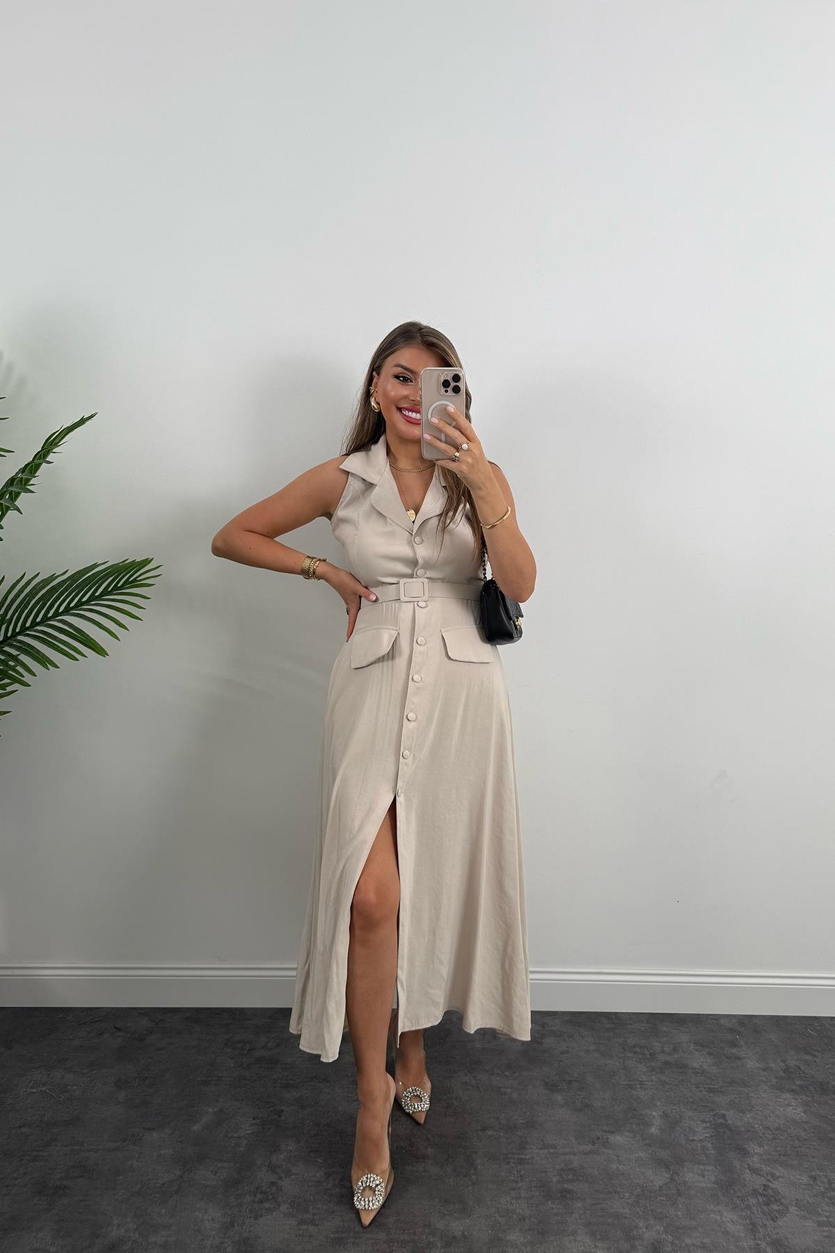 %100 Tensel Kumaş Lüx Kalite Düğmeli Kemerli Maxi Elbise Taş (A13876)