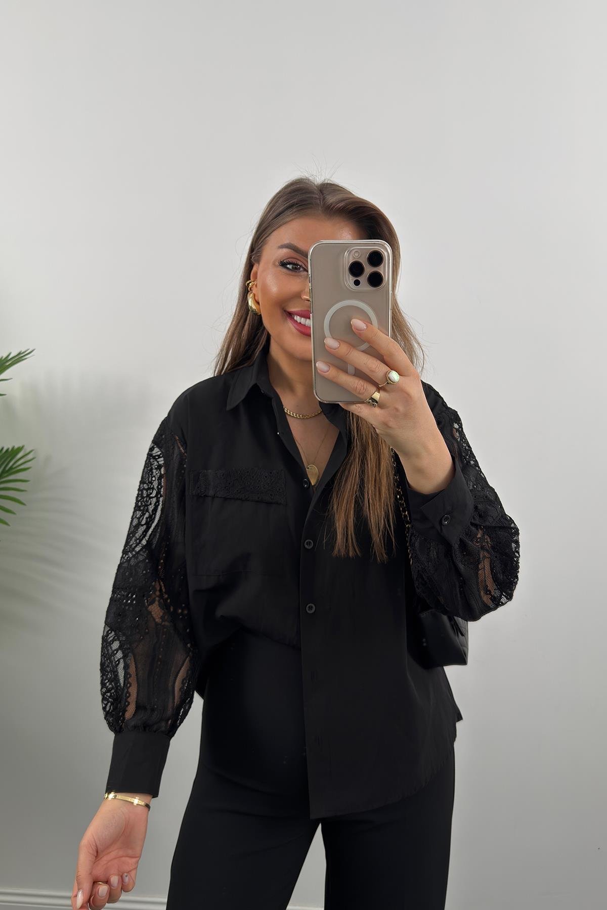 Bebe Marka Kolları Dantel Tasarım Gömlek Siyah
