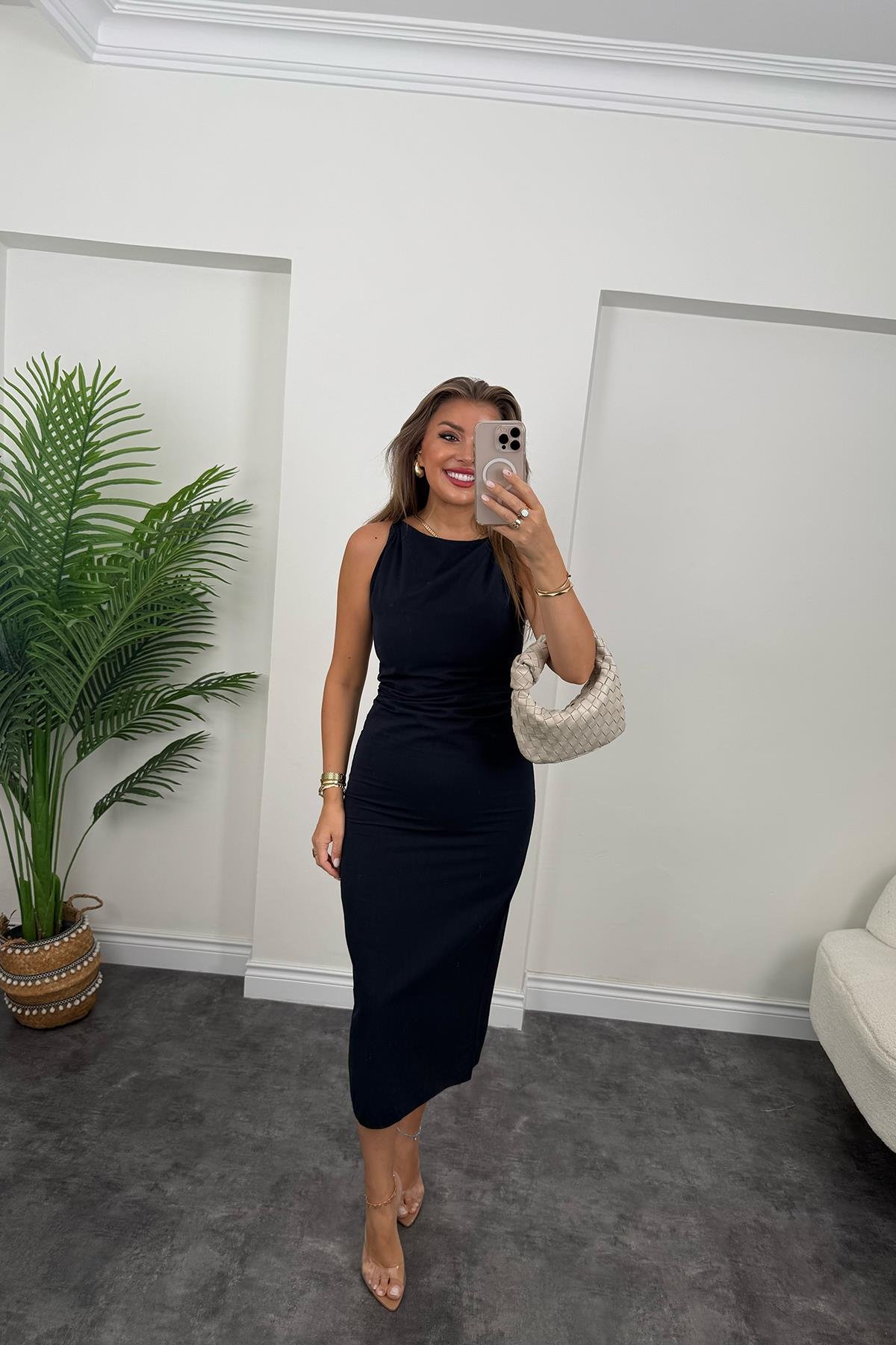 Dönük Askılı Midi Boy Basic Keten Elbise Lacivert