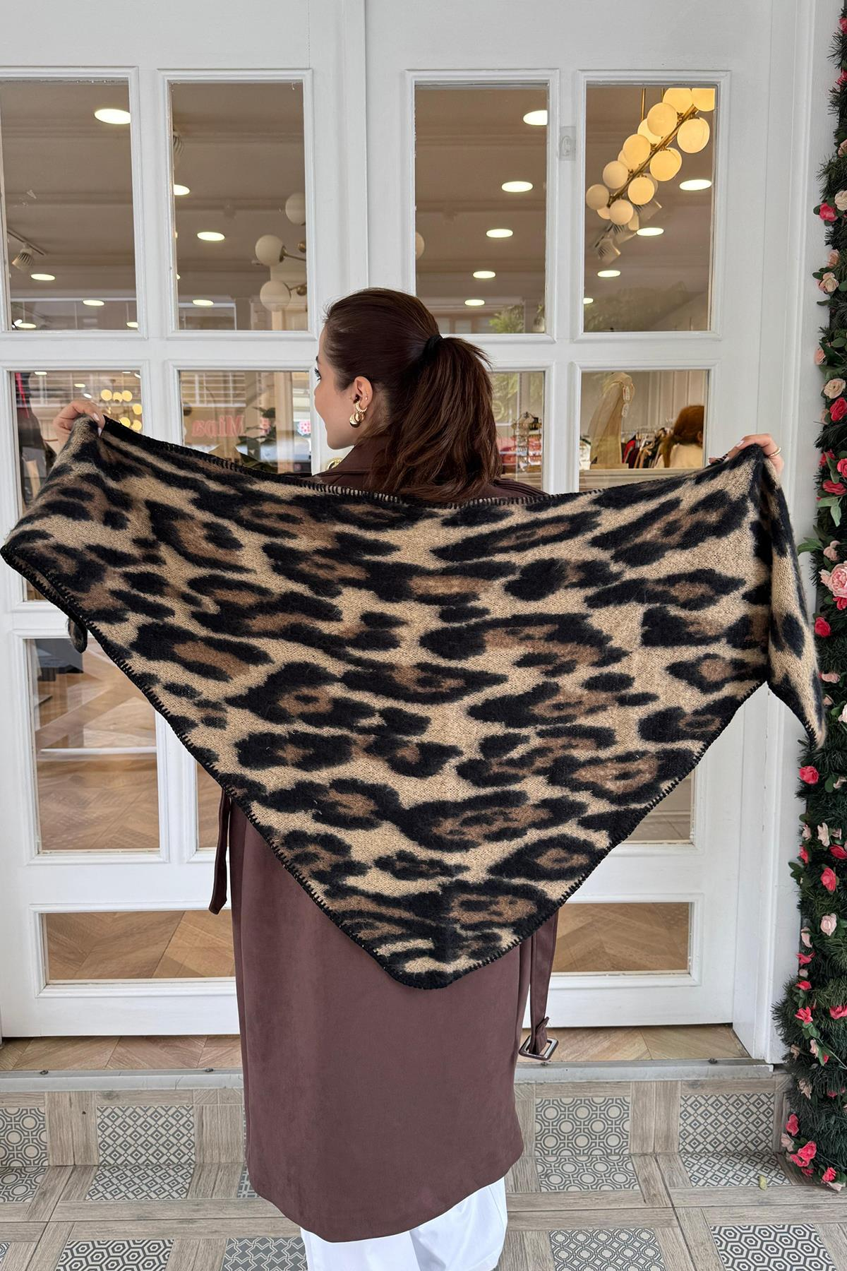 Kahverengi Leopar Desen Üçgen Şal