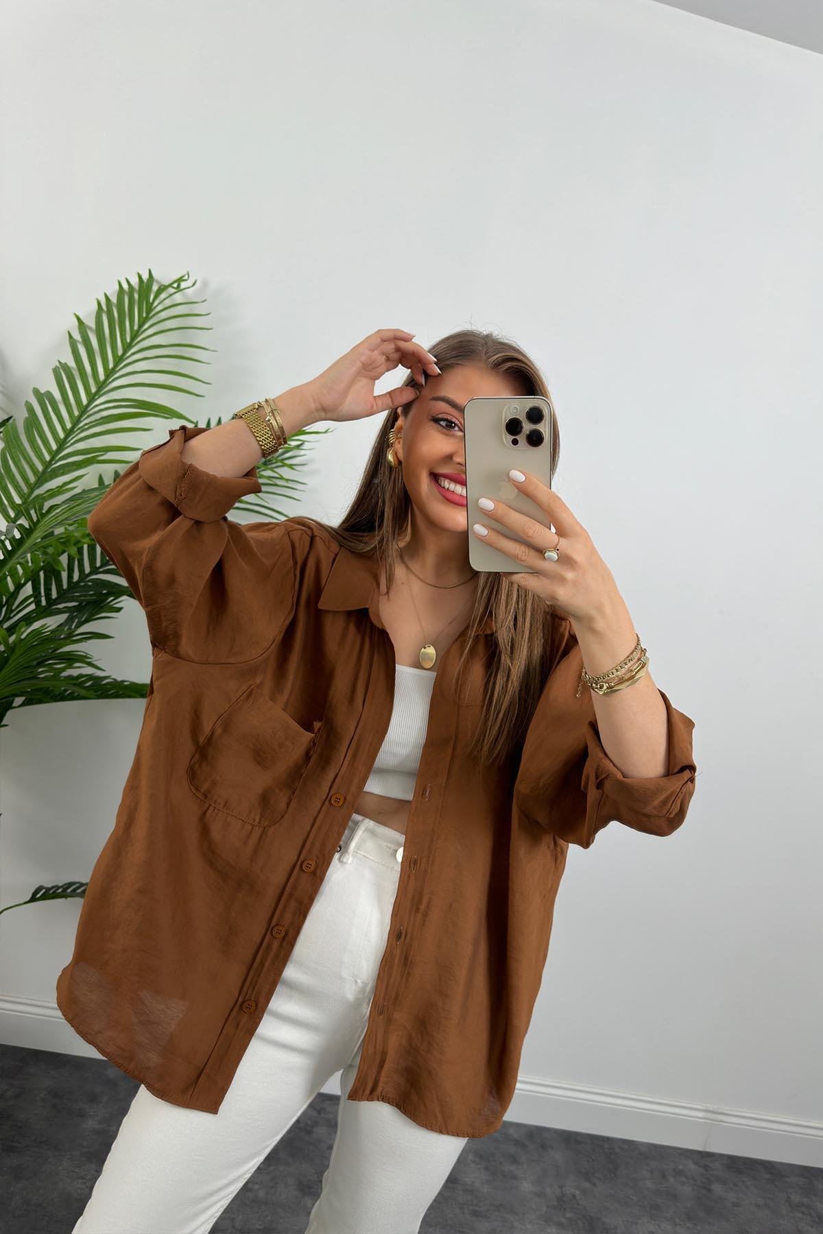 Lüx Kalite Basic Salaş Tensel Gömlek Kahve (A10798)