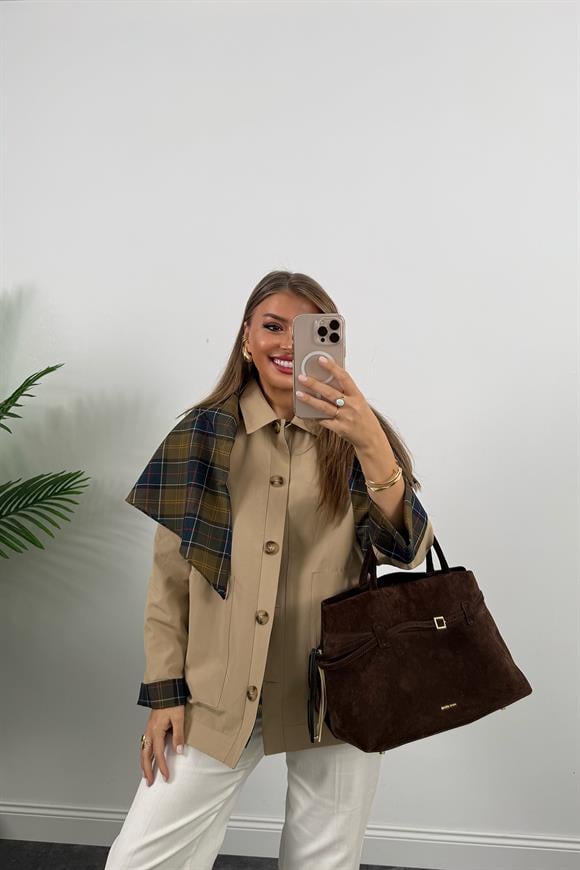 Lüx Kalite Ekoseli Şallı Tasarım Trençkot Bej