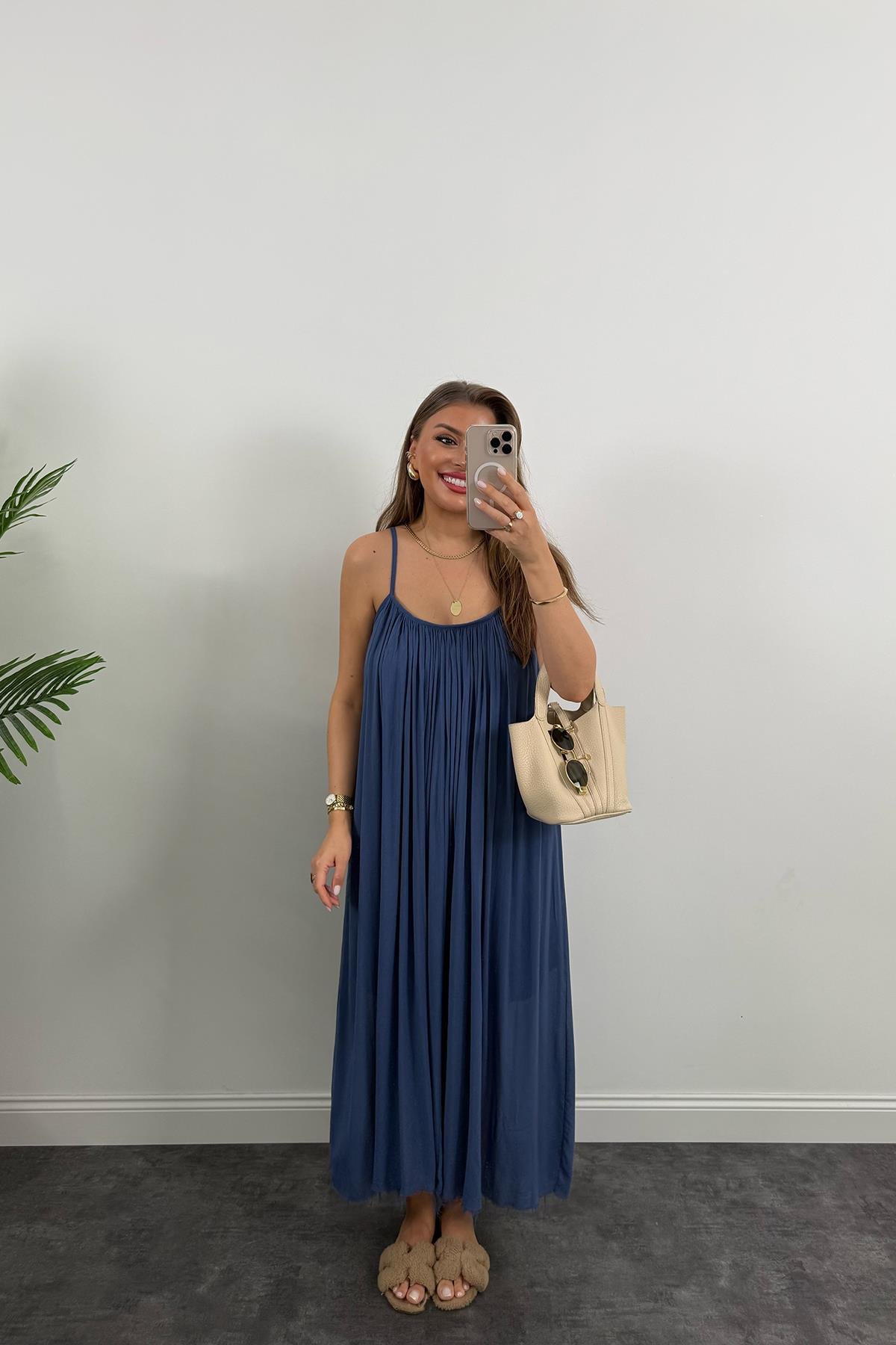 Lüx Kalite Naturel Seri %100 Pamuklu Astarlı Maxi Elbise İndigo