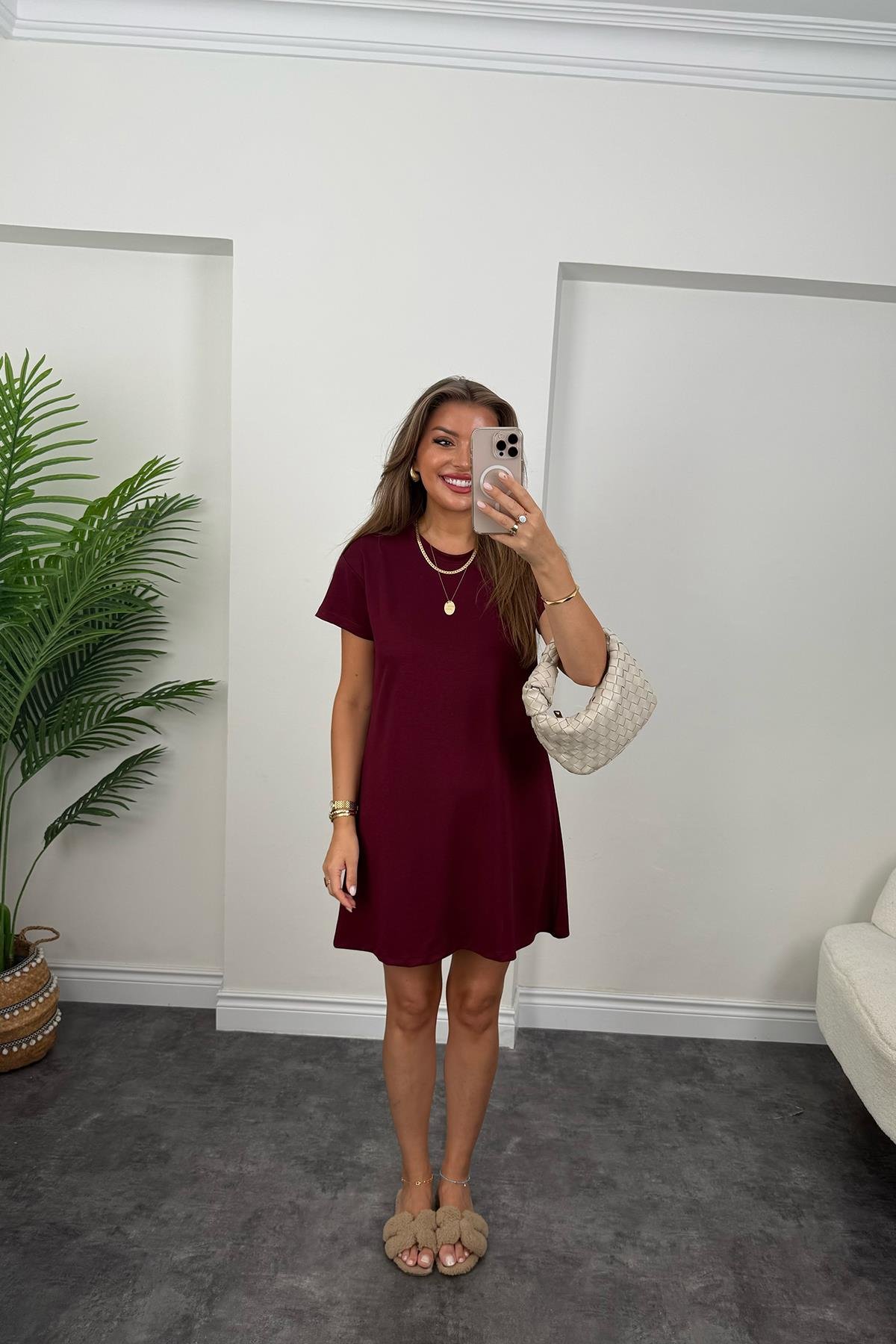 Lüx Kalite Oyhs Kumaş Kısa Kol Basic Elbise Bordo (A14714)