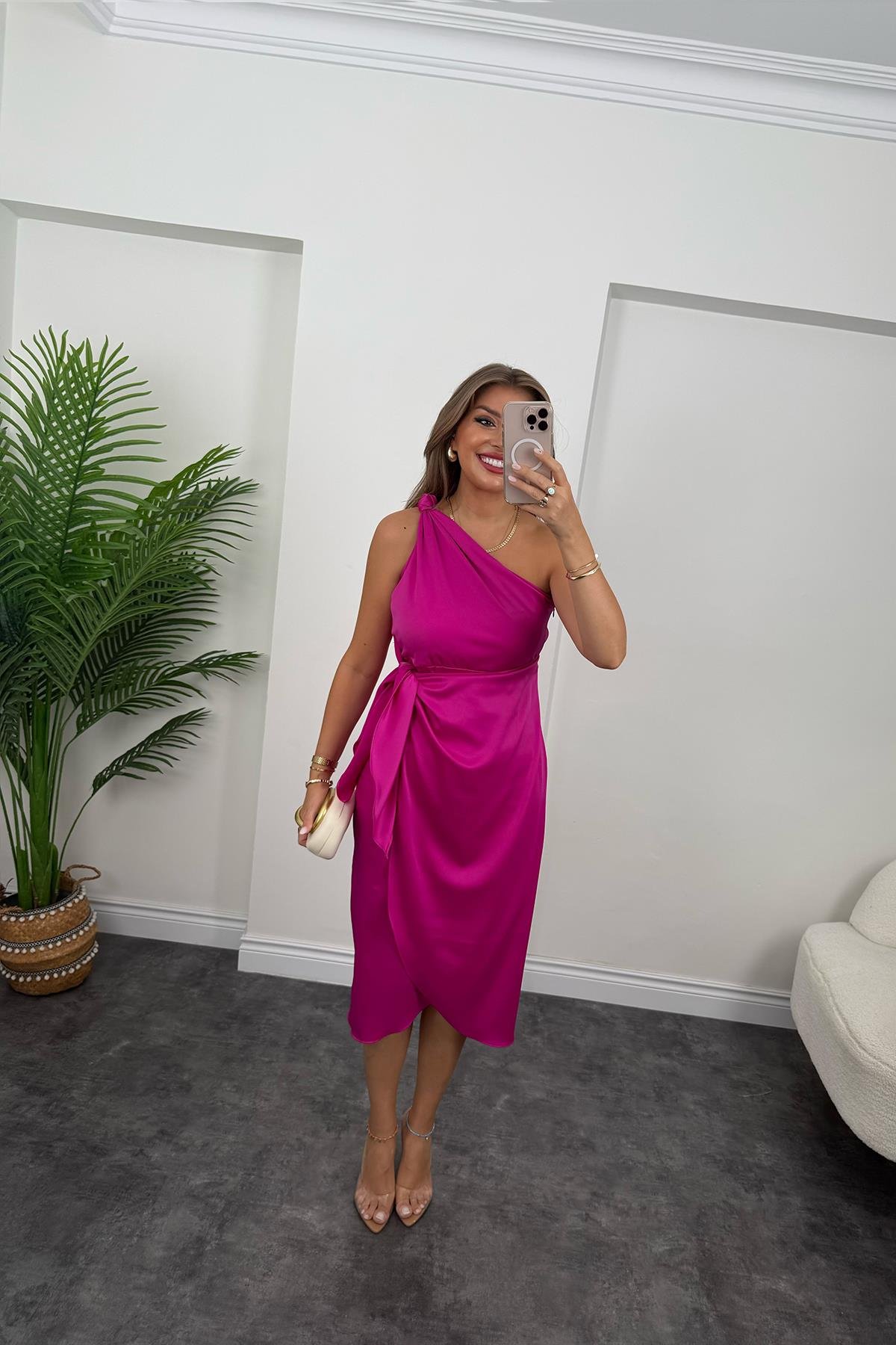 Lüx Kalite Tek Omuz Midi Boy Anvelop Elbise Fuşya (A11564)