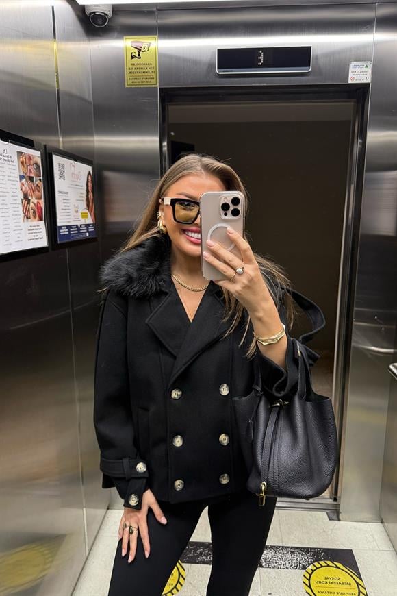 Lüx Kalite Yakası Kürklü Apoletli Kaşe Trenç kaban Lüx Kalite Yakası Kürklü Apoletli Kaşe Trenç kaban Siyah