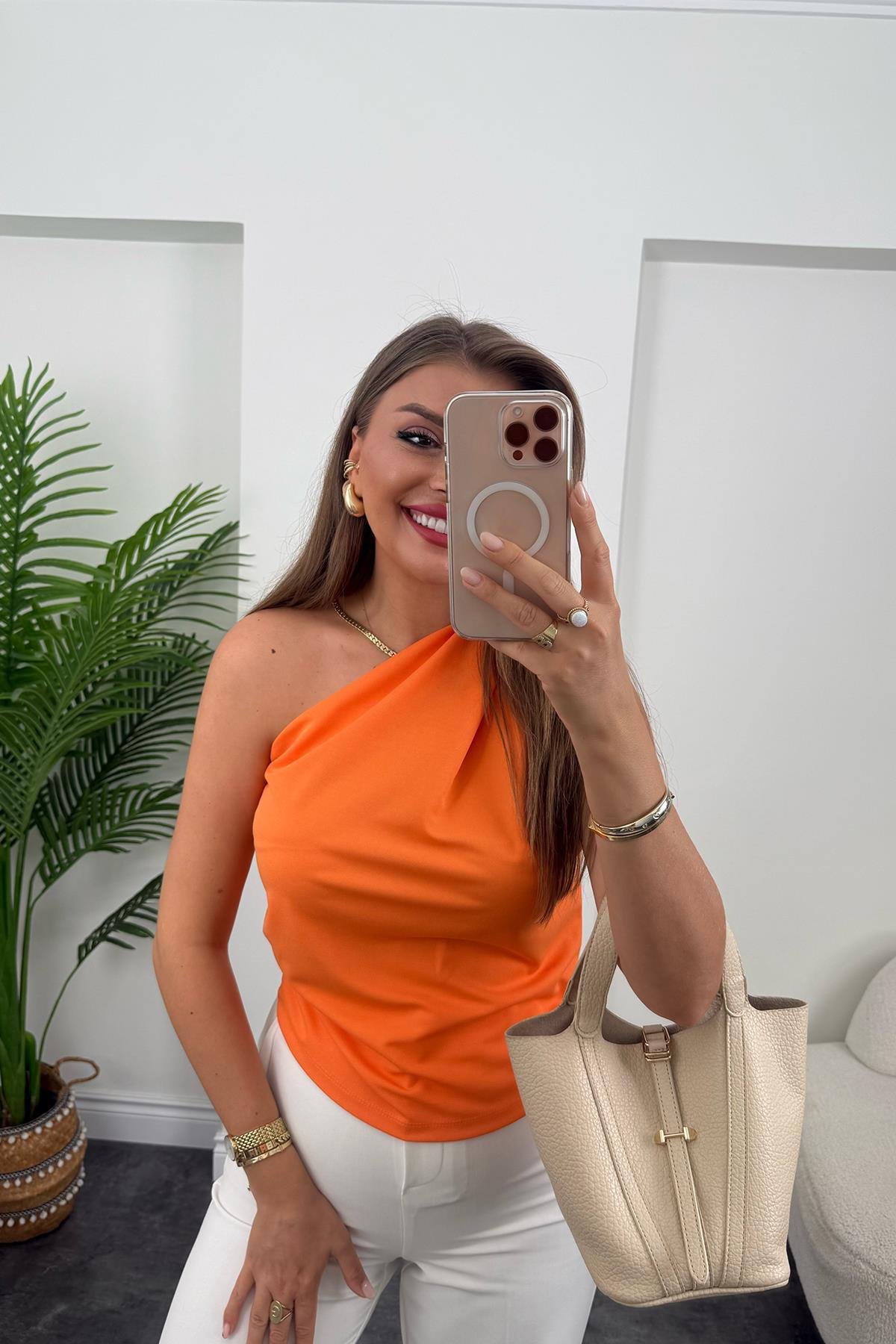 Marka Model Likralı Drapeli Tek Omuz Tasarım Bluz Turuncu