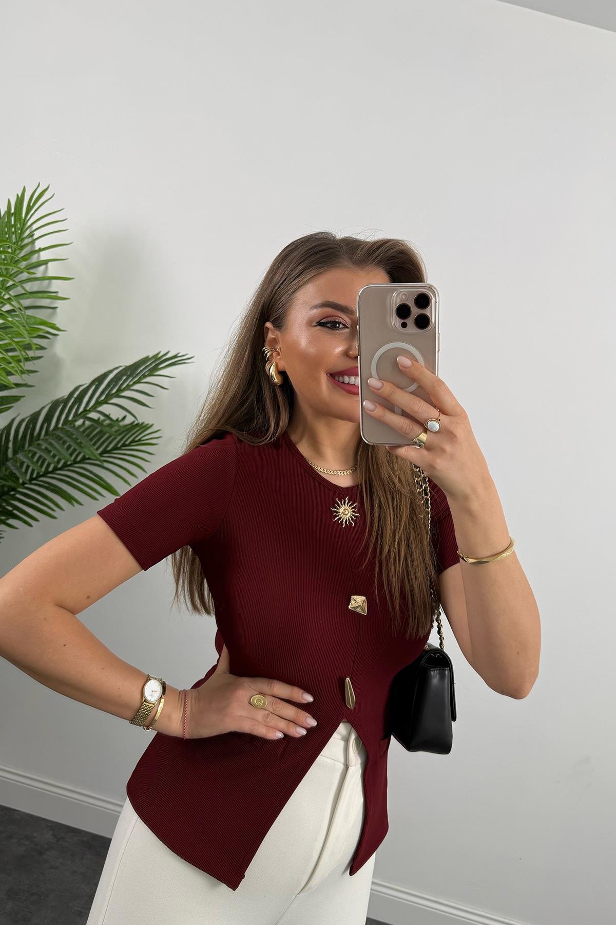 Ottoman Kumaş Güneş Serisi Kısa Kol Likralı Eteği V Bluz Bordo (A13445)