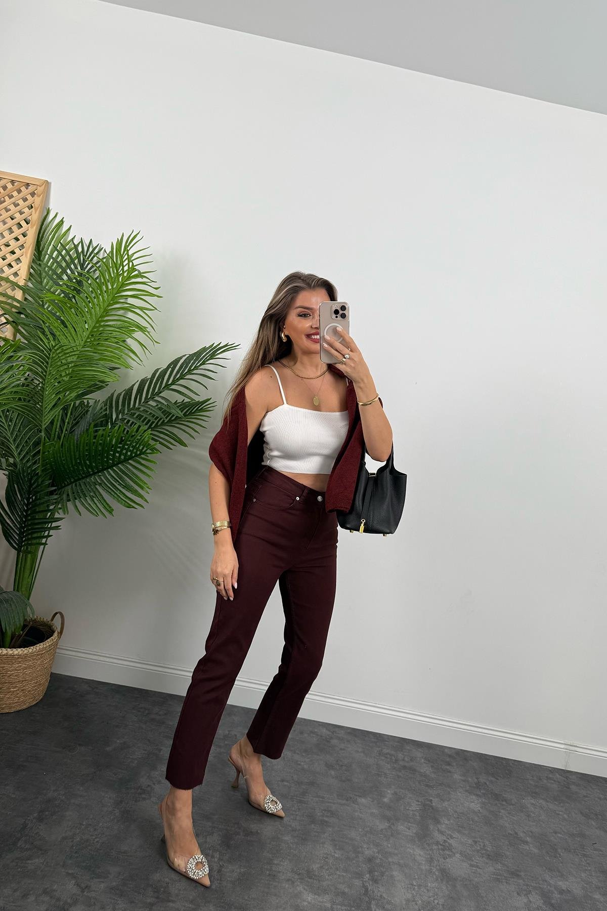 Premium Kalite Paçası Kesik Likralı Boyfit Jean Bordo