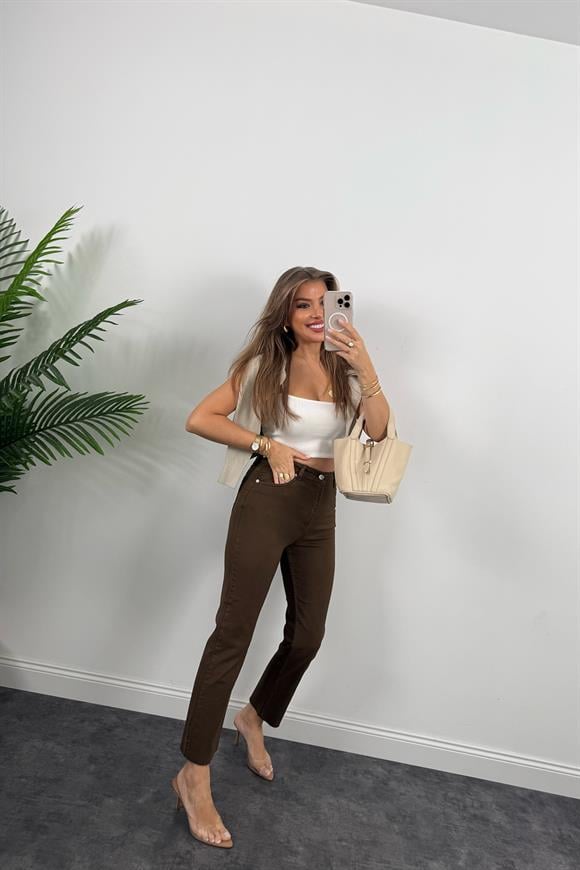 Premium Kalite Paçası Kesik Toparlayıcı Boyfit Jean Acı Kahve