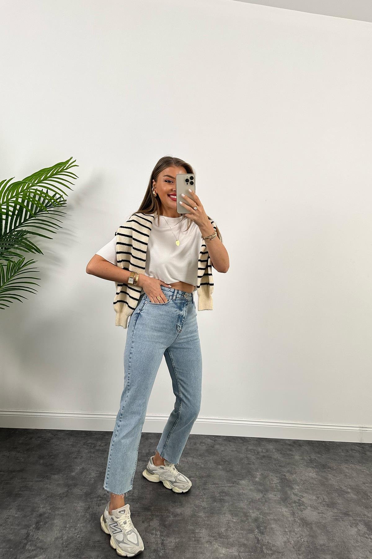 Premium Kalite Paçası Kesik Toparlayıcı Boyfit Jean Yıkamalı Mavi