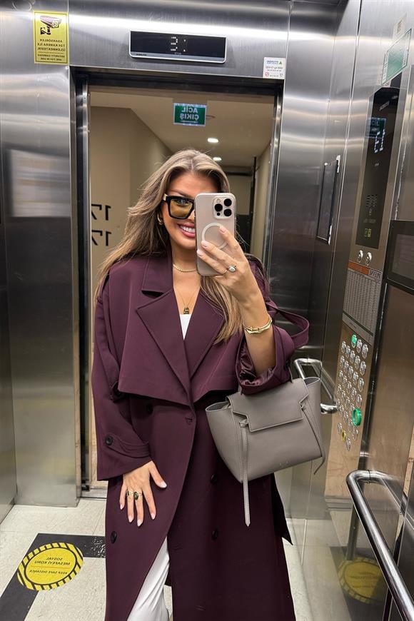 Premium Kalite Poliviskon Kumaş Astarlı Trençkot Mürdüm