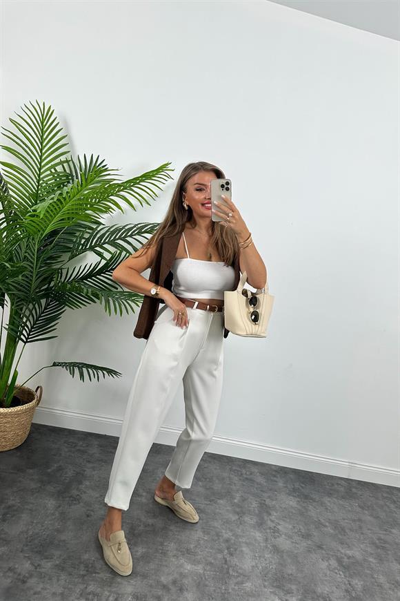 Premium Kalite Tok Kumaş Kemerli Havuç Pantolon Beyaz (A10228)
