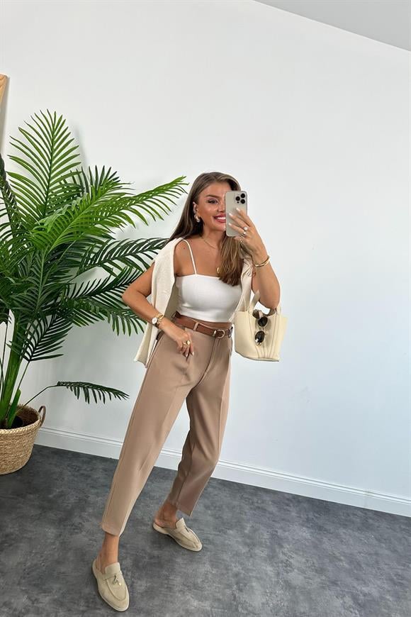 Premium Kalite Tok Kumaş Kemerli Havuç Pantolon Camel