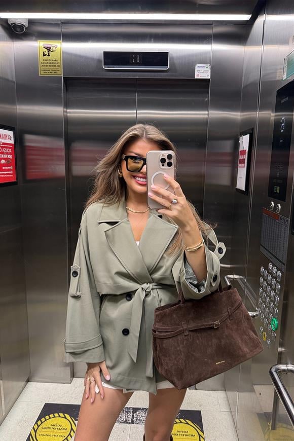 Premium Seri Lüx Poliviskon Trençkot Orta Boy Haki (A15226)