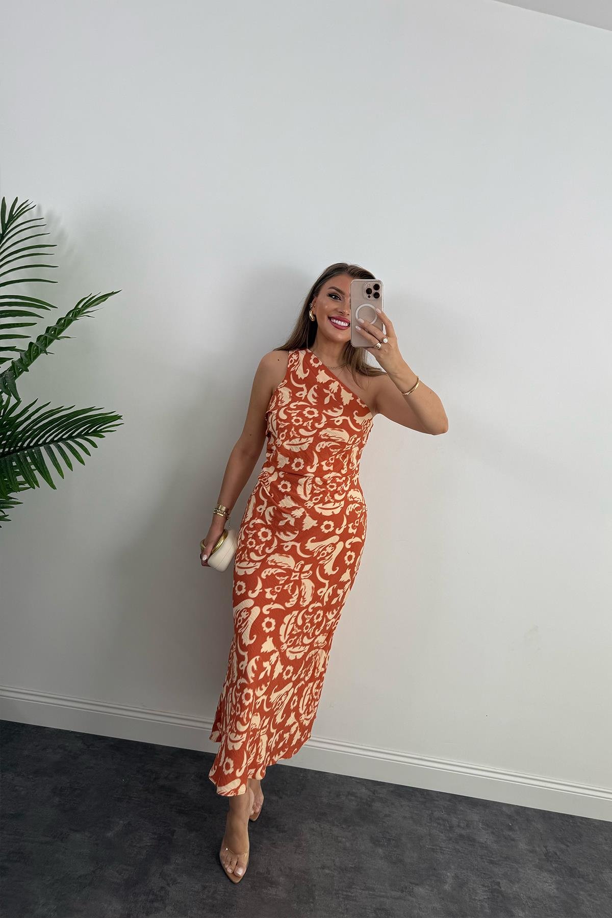 Premium Seri Tek Omuz Keten Midi Elbise Kiremit Krem (A14249)