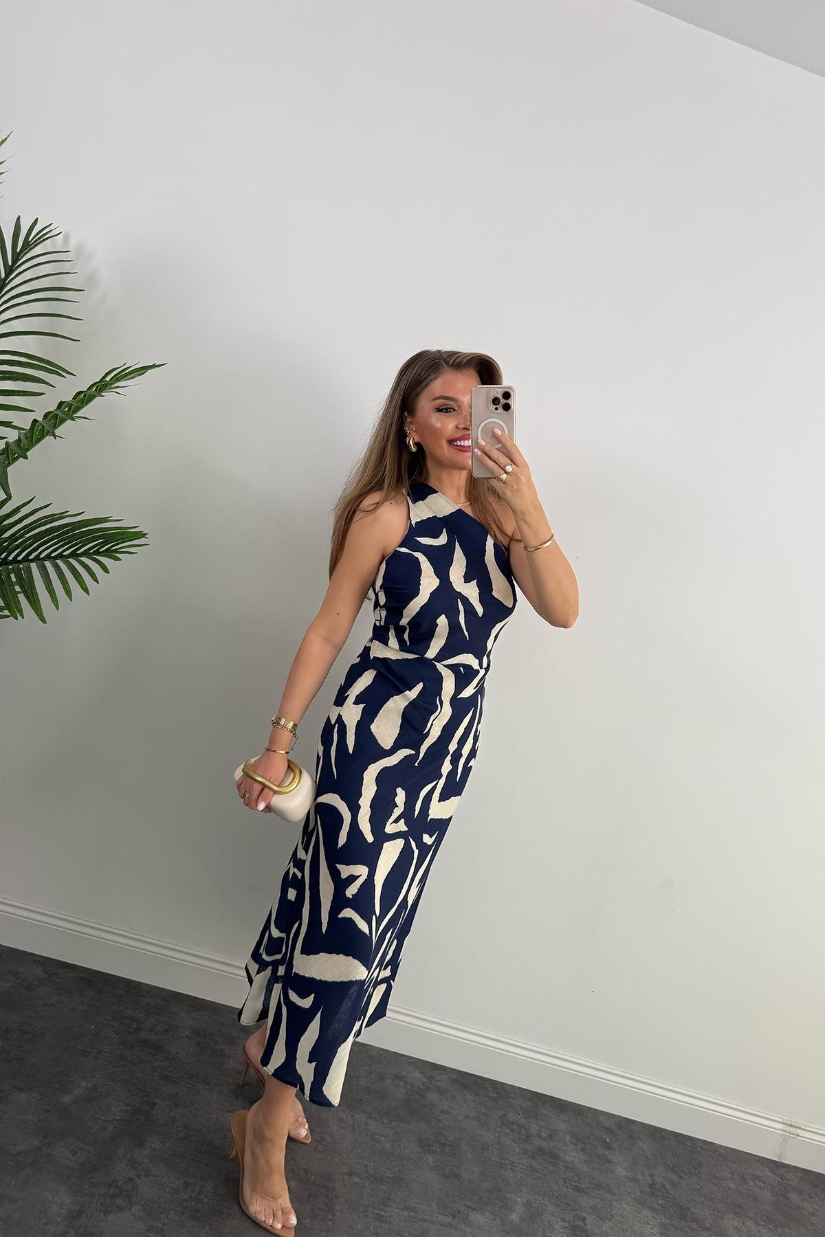 Premium Seri Tek Omuz Keten Midi Elbise Lacivert Krem