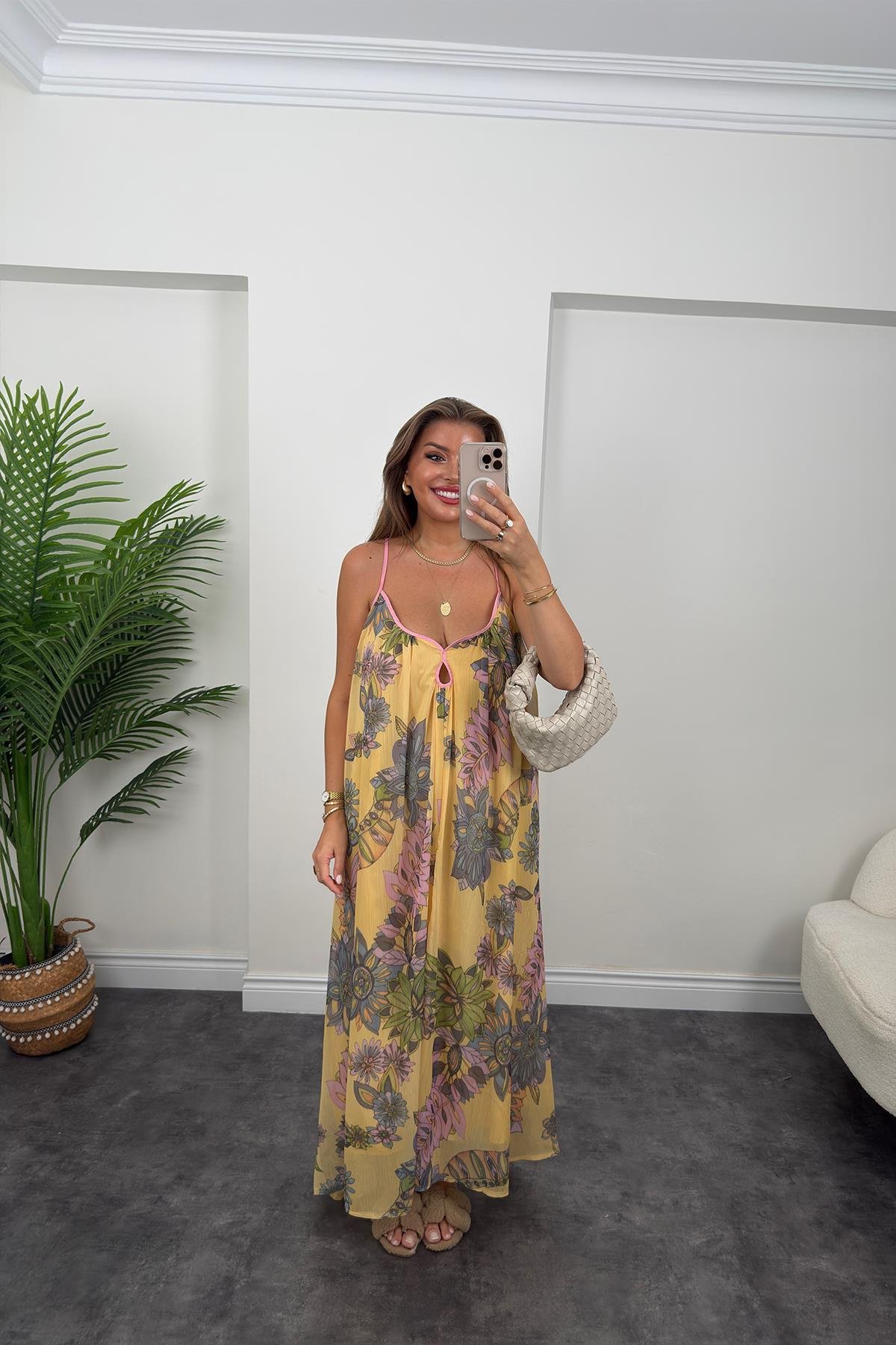 Rüya Serisi Maxi Salaş Şifon Elbise Sarı Desenli