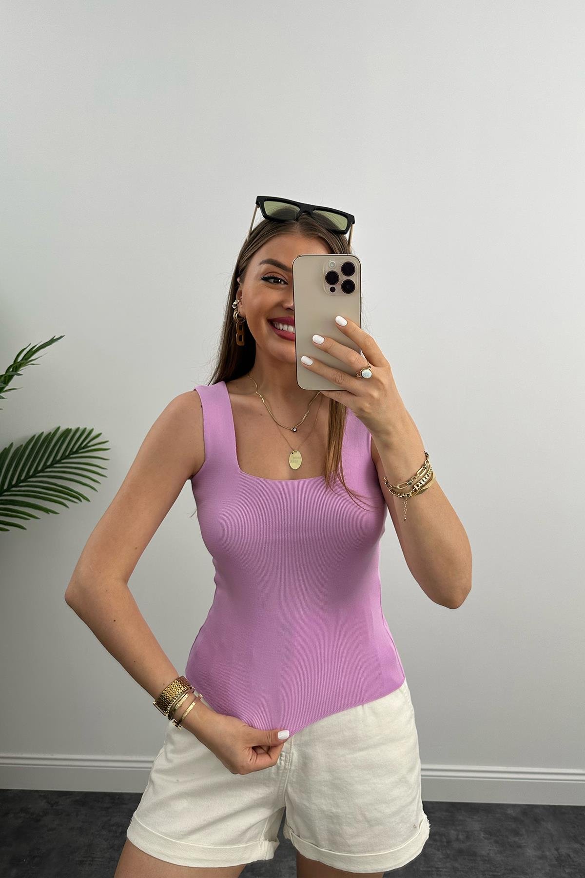 Uzun Boy Elit Triko Kare Yaka Likralı Atlet Lila (A8199)