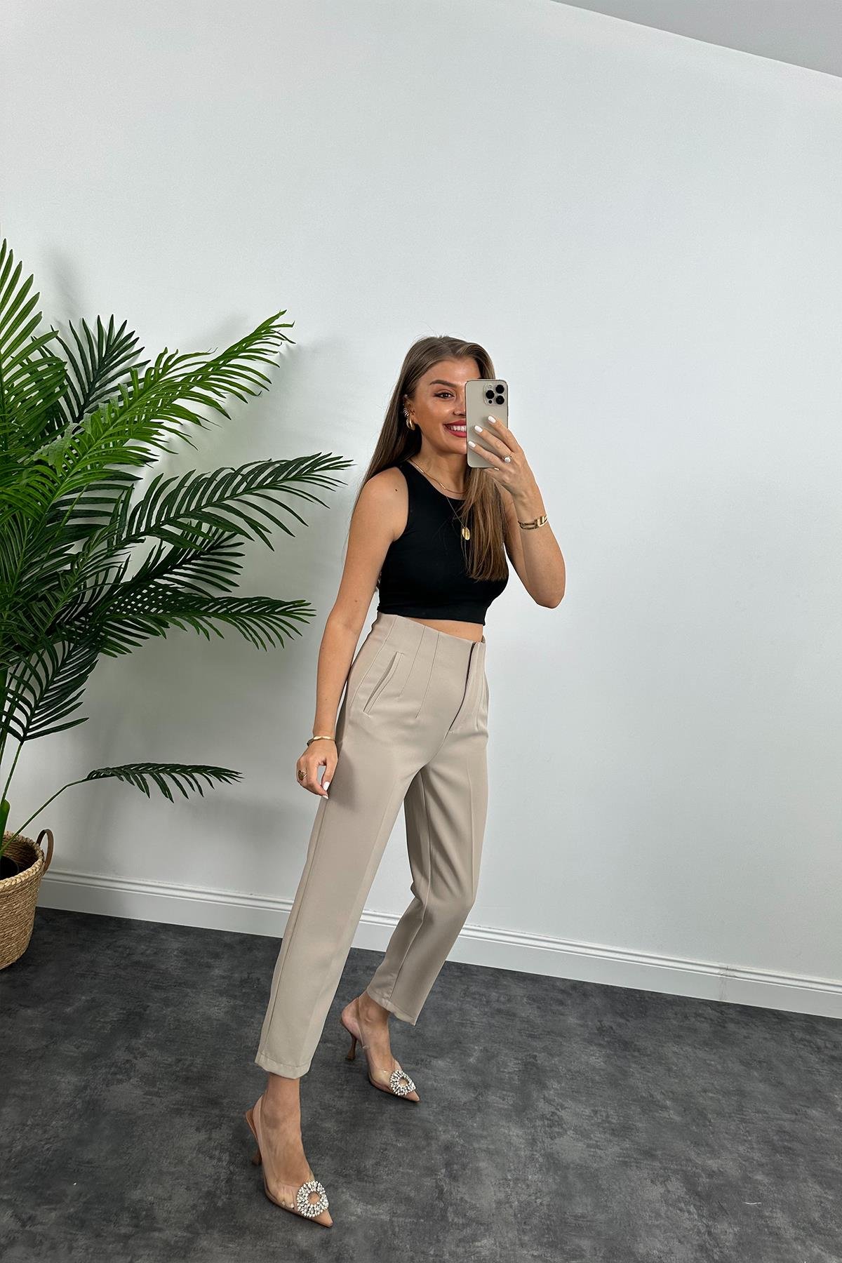 Zra Model Double Atlas Kumaş Yüksek Bel Flatolu Kumaş Pantolon Taş (A10908)